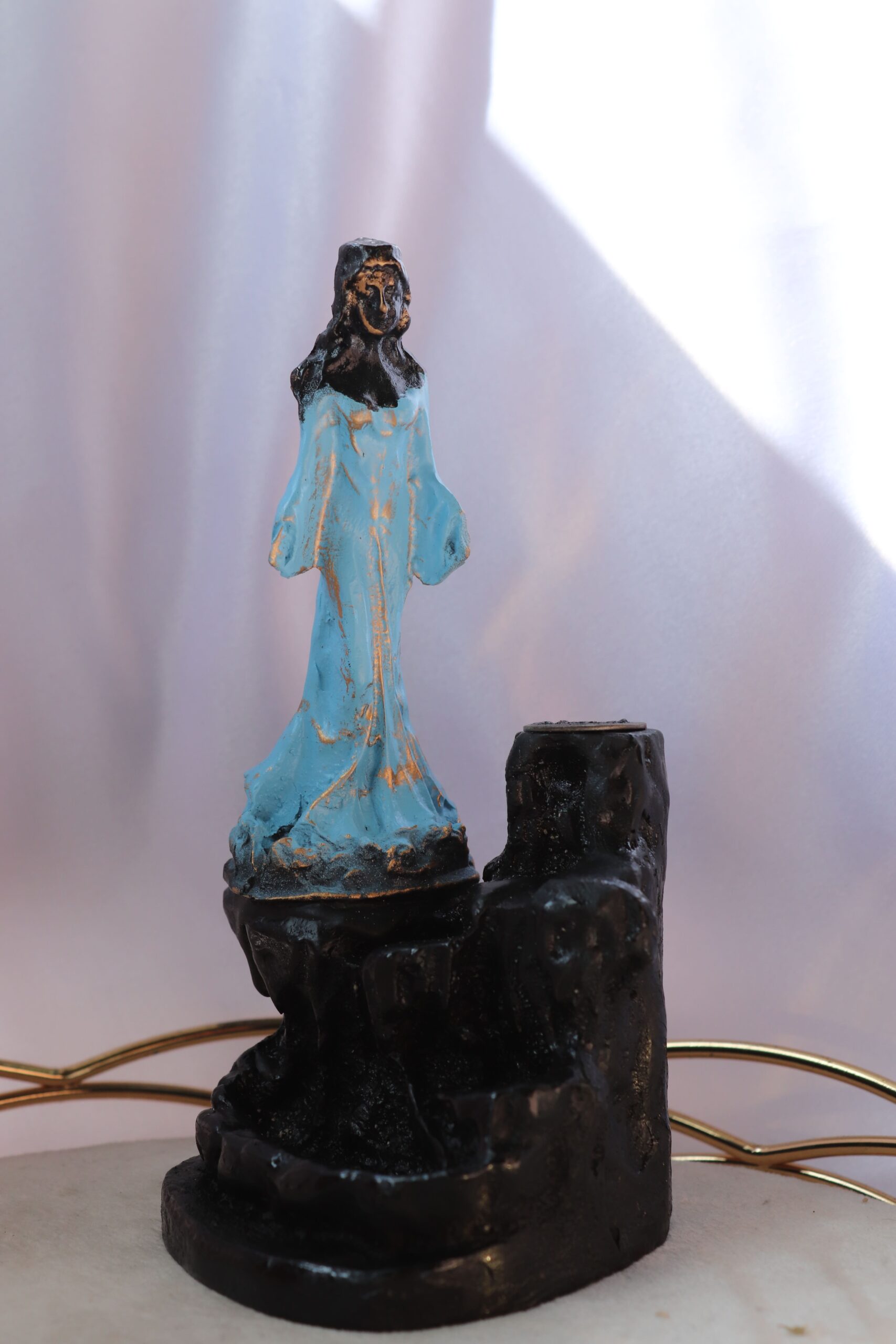 Fonte de fumo decorativa com imagem de Iemanjá, Orixá das águas, da maternidade e da proteção. Ideal para utilizar com incensos de refluxo, criando um efeito visual envolvente semelhante a uma cascata de fumo.