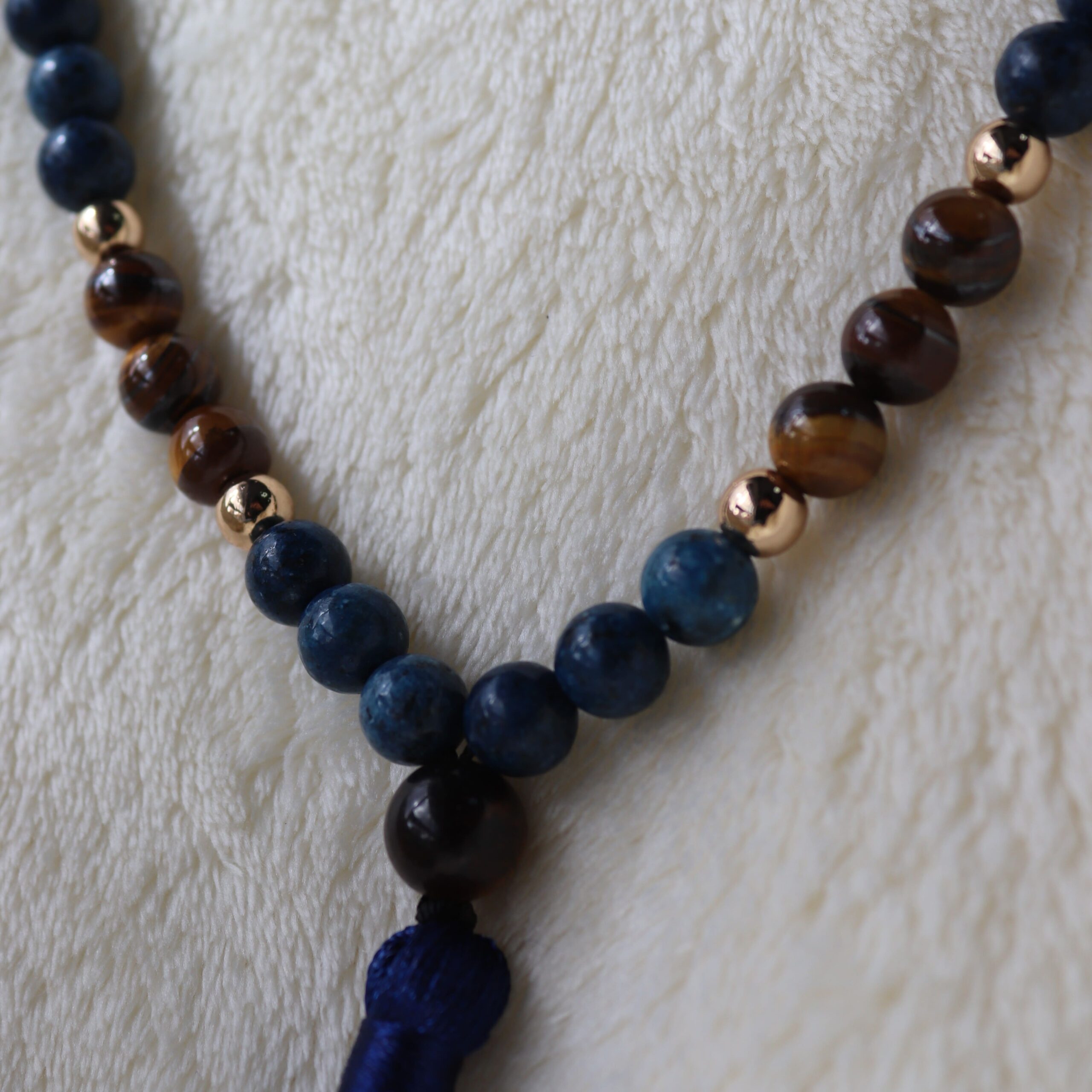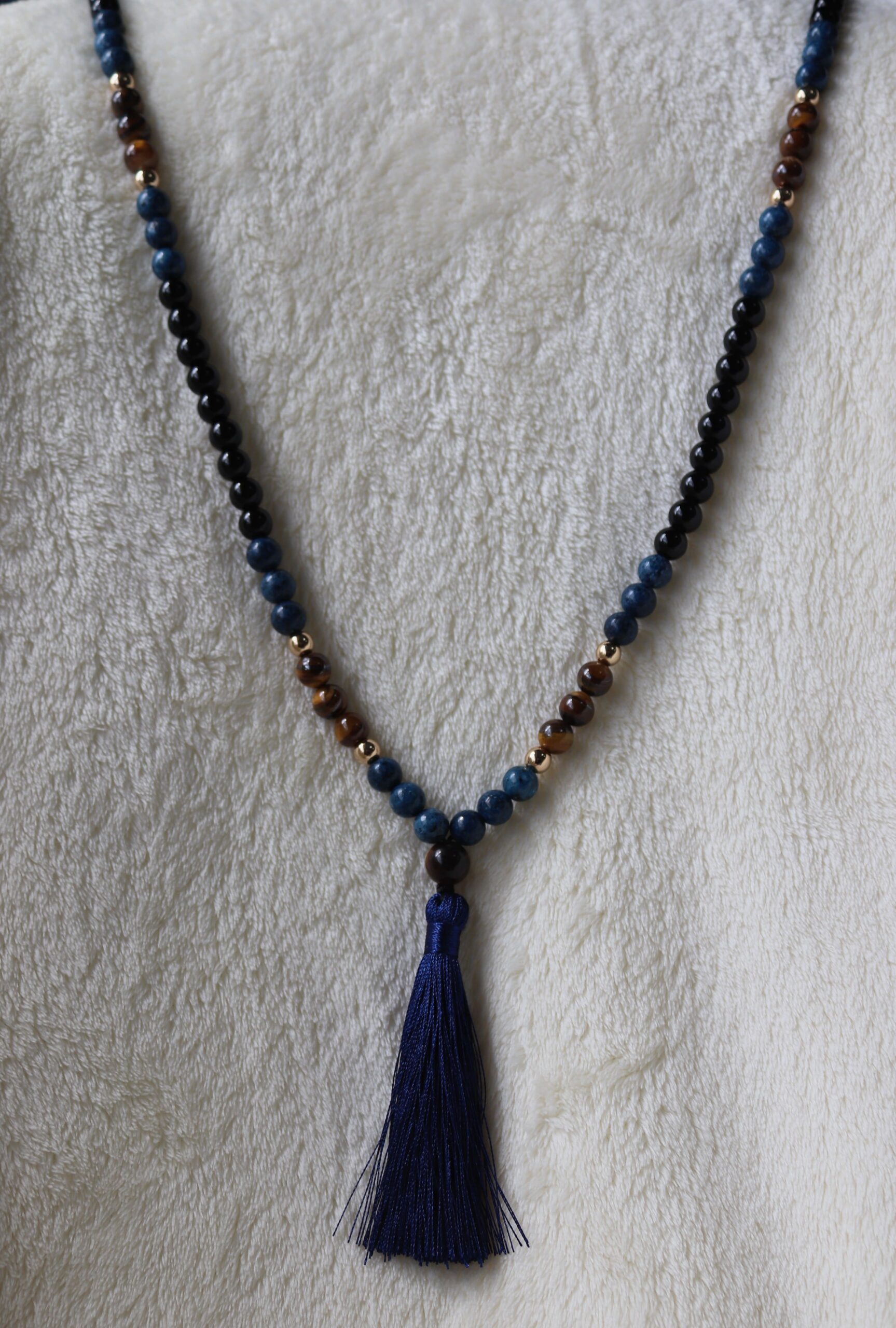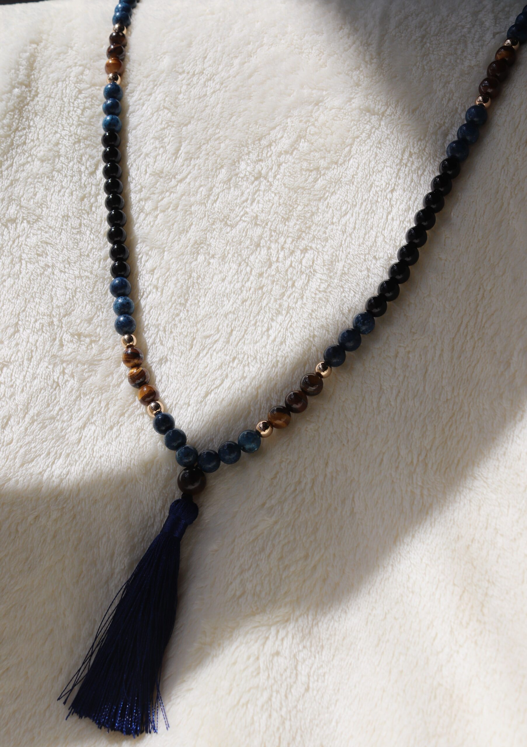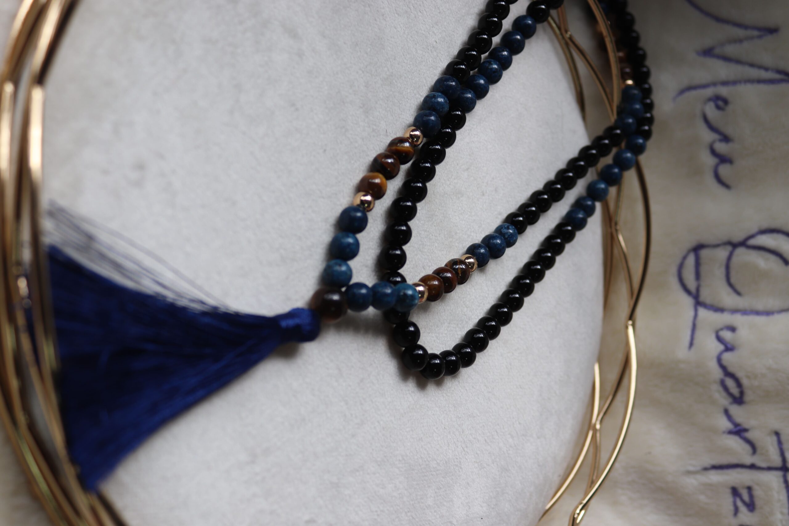 Este japamala combina a força do Ônix, a coragem do Olho de Tigre e a estabilidade da Ágata. Juntas, essas pedras formam um amuleto poderoso de proteção, foco e equilíbrio emocional. Com 108 contas, é ideal para meditação, mantras ou simplesmente para usar como acessório espiritual que fortalece a energia e a conexão interior.